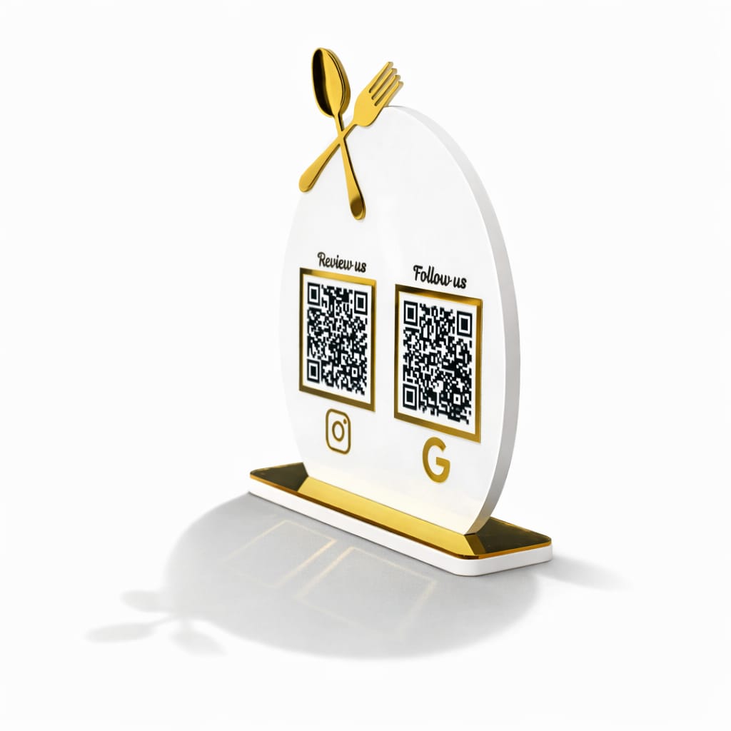 Ek hi standee par 2 QR codes – reviews, menu, payment, website ya social links ke liye perfect.